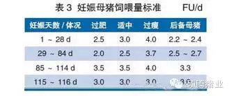 配種后28d內(nèi)一般采取限位欄飼養(yǎng),根據(jù)母豬膘情飼喂(表3),配種后24d使用B超進(jìn)行妊娠診斷,28d將已懷孕母豬轉(zhuǎn)入妊娠舍飼喂,根據(jù)歐盟動(dòng)物福利法規(guī),母豬妊娠期間不允許使用定位欄飼養(yǎng),必須采取群養(yǎng)方式。妊娠階段采用3段式飼喂方法,即配種后1~28d,配種后29~84d,配種后85~114d,產(chǎn)前1周將母豬轉(zhuǎn)入分娩舍。