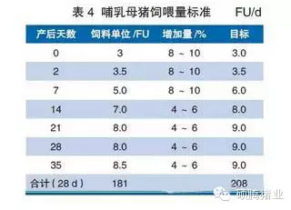 轉(zhuǎn)入分娩舍的母豬飼喂哺乳料,由于丹系豬產(chǎn)仔數(shù)較多,往往會(huì)出現(xiàn)產(chǎn)仔數(shù)超過母豬自身乳頭數(shù)的現(xiàn)象,因此分娩前要記錄每頭母豬的有效乳頭數(shù),方便分娩后對(duì)多余的仔豬進(jìn)行寄養(yǎng),分娩后對(duì)每窩產(chǎn)仔數(shù)進(jìn)行統(tǒng)計(jì),對(duì)超出乳頭數(shù)需要寄養(yǎng)的仔豬在寄養(yǎng)前必須吃足初乳。一般將窩中體重較大仔豬寄出,寄養(yǎng)時(shí)應(yīng)事先找好奶媽豬,最好選擇1~2胎的母豬做奶媽豬,因?yàn)槟肛i乳頭較細(xì),方便初生仔豬吸吮乳頭。寄養(yǎng)分為一步法或二步法,一步法操作比較簡(jiǎn)單,將即將斷奶母豬進(jìn)行斷奶,母豬轉(zhuǎn)入剛產(chǎn)產(chǎn)房,將每窩多余仔豬取出交給該母豬代養(yǎng);二步法操作稍麻煩,先將即將斷奶母豬進(jìn)行斷奶,然后選擇產(chǎn)后7~10d母豬(中間奶媽豬)的仔豬給該母豬代養(yǎng),再將初生多余仔豬交給該頭產(chǎn)后7~10d母豬代養(yǎng)。分娩后應(yīng)逐漸增加喂料量,避免加料過急導(dǎo)致哺乳母豬中后期采食下降,每天飼喂3~4次,哺乳母豬飼喂量標(biāo)準(zhǔn)見表4。