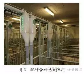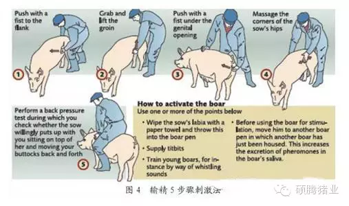 母豬斷奶后轉(zhuǎn)入配種舍,斷奶后母豬應(yīng)給予充分飼喂,可以促進(jìn)盡早發(fā)情,每天飼喂4.5~5FU,在丹麥大部分豬場(chǎng)配種舍和妊娠舍母豬都是飼喂懷孕料,每天飼喂1次,另外為了促進(jìn)斷奶后母豬發(fā)情,配種舍需要人工補(bǔ)充光照,每天提供16h光照(圖3),光照強(qiáng)度為200Lux,斷奶后的公豬誘情刺激也是非常重要的,同時(shí),考慮到豬場(chǎng)員工的工作節(jié)律和休息,在丹麥一般農(nóng)場(chǎng)都是星期四斷奶,斷奶當(dāng)天加上星期五、星期六每天讓斷奶母豬接觸公豬2h,以促進(jìn)母豬發(fā)情,星期日將公豬撤離,星期一上午就可以開始查情配種了,關(guān)于輸精時(shí)間,處理方案是星期天及星期一上午發(fā)情的母豬,星期一下午輸精,星期一下午發(fā)情母豬,星期二上午輸精,星期二發(fā)情母豬,出現(xiàn)靜立發(fā)射立即配種,一般一個(gè)情期輸精2次,輸精間隔為18~24h,采用常規(guī)子宮頸輸精方式,輸精的精子數(shù)量為20億。另外在丹麥的農(nóng)場(chǎng),對(duì)每頭即將輸精的母豬都會(huì)采取一種叫做“五步刺激法”的處理方式(圖4),首先撫摸母豬兩側(cè)肋部,其次用手抓住腹股溝處皮膚用力往上提,然后用拳頭按壓母豬外陰,再按壓母豬腰薦部,最后人騎到母豬背上,整個(gè)處理過程不超過1min,可以讓母豬迅速穩(wěn)定下來,處于靜立反應(yīng),提高配種成功率。
