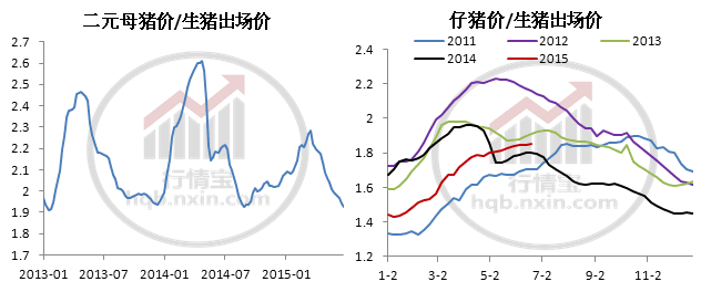 6月份二元母豬價格相比5月份僅上漲1.1%,生豬價格月環(huán)比上漲達4.7%。二元母豬價格與生豬價格的比值進一步下降至1.92。盡管種豬企業(yè)反映銷售情況火爆,未達標體重小母豬也已提前預定銷售,但是,這并不能說明養(yǎng)豬戶已經(jīng)開始大規(guī)模補欄后備母豬。行情寶小編判斷,種豬銷售火爆的原因有兩個:一是去年的深度虧損使得種豬企業(yè)經(jīng)營更加慘淡,由于種豬企業(yè)投入成本更大,因此相比較育肥虧損更深,導致許多種豬企業(yè)縮減規(guī)模,部分種豬企業(yè)減少育種、轉(zhuǎn)型育肥,由此帶來今年種豬供應量的減少;二是上一個周期高點時補入的后備和能繁母豬到今年正好進入淘汰期,豬價上漲增強了養(yǎng)殖戶對后市的信心,部分養(yǎng)殖戶開始積極更換新的能繁和后備母豬群。