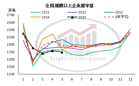 就下半年生豬供應量來看,將會呈現(xiàn)逐漸縮緊的狀態(tài)。2014年豬價從9月后開始直線下跌,中秋與國慶雙節(jié)未能提升豬價讓虧損一年半的養(yǎng)豬人對豬市心灰意冷,從母豬存欄數(shù)據(jù)也可以看出,2014年10月以后母豬淘汰量開始明顯增加,也就是說當時養(yǎng)殖戶對豬市前景十分悲觀,那么當時的配種率也會有所降低。因此相對應的9個月后生豬供應量,也就是今年7月份開始的下半年,市場的生豬可供量將會逐月遞減。這給下半年豬價的上漲帶來有力支撐。