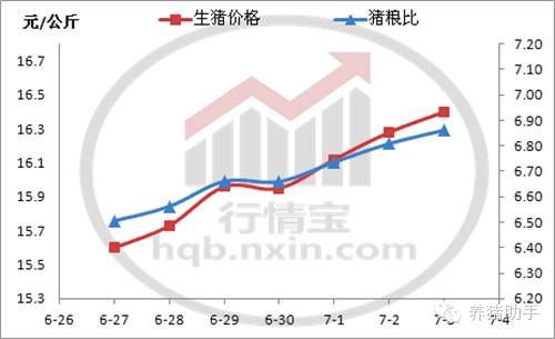 行情寶分析本周(6月27日至7月3日)全國生豬(外三元)均價迅速上漲,北方地區(qū)持續(xù)上周漲勢,南方地區(qū)豬價在本周也開啟上漲。6月27日全國生豬均價為15.6元/公斤,至7月3日,生豬均價漲至16.4元/公斤。豬糧比本周上升至6.86:1,自繁自養(yǎng)頭均盈利突破280元。