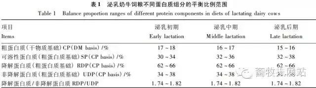 對(duì)于反芻動(dòng)物而言,飼糧氨基酸營(yíng)養(yǎng)平衡的重點(diǎn)就是飼糧中蛋白質(zhì)組分之間的平衡。首先要根據(jù)動(dòng)物生產(chǎn)水平和目的確定飼糧蛋白質(zhì)總水平,其次要充分考慮飼糧蛋白質(zhì)中可溶性蛋白質(zhì)(SP)、降解蛋白質(zhì)(RDP)與非降解蛋白質(zhì)(UDP)之間的平衡。NRC(2001)奶牛營(yíng)養(yǎng)需要量中給出了不同蛋白質(zhì)組分的平衡比例范圍,詳見(jiàn)表1。