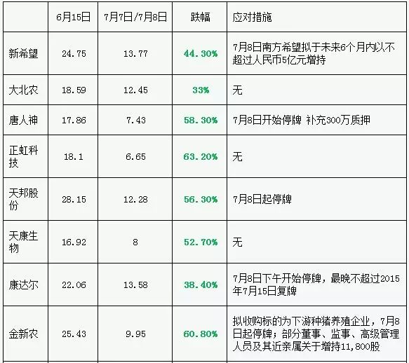 面對這次股災,除了國家?guī)状纬鍪志仁?,但收效甚微,截?月8日,滬指跌5.90%;創(chuàng)業(yè)板翻紅,漲幅0.51%,除去1400家停牌,仍有近千只股票跌停。這種情況下,上市飼料企業(yè)紛紛展開自救。12家上市企業(yè)中,9家采取了措施,其中7家采取了停牌。