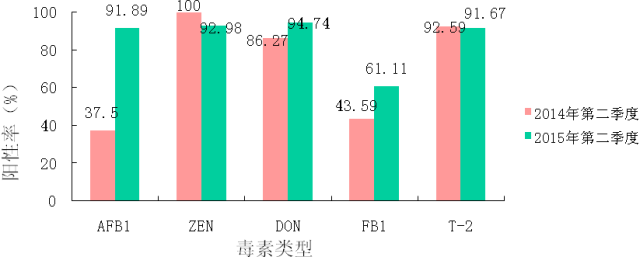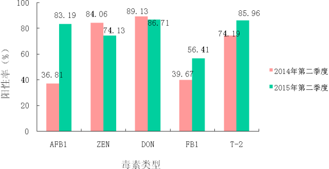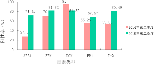 2015年第二季度玉米、麩皮﹑全價料等飼料及原料中黃曲霉毒素B1(AFB1)、玉米赤霉烯酮(ZEN)、嘔吐毒素(DON)、T-2毒素均呈現(xiàn)較高陽性率。需特別注意的是所有送檢樣品中AFB1的陽性檢出率達83.19%,遠高于去年同期(2014年4~6月AFB1陽性率36.81%)。