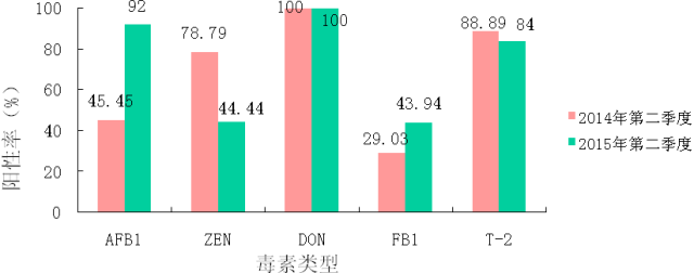 趨勢:2015年第二季度麩皮樣品中AFB1﹑DON、T-2這三種霉菌毒素污染率較高,均在84%以上。