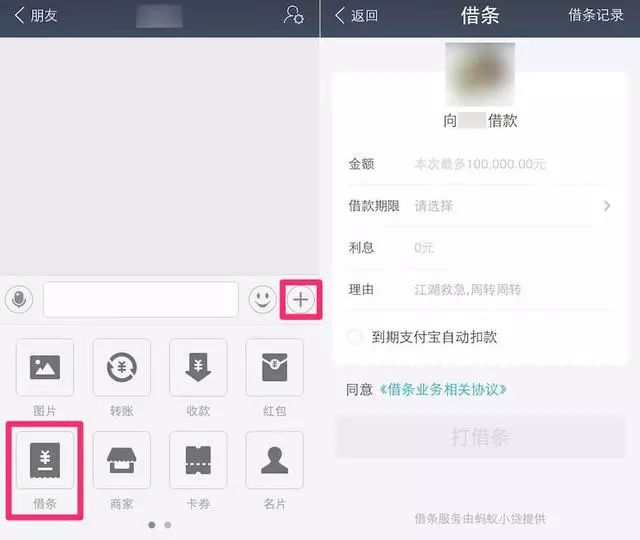 如果你想用支付寶借錢,打開支付寶9.0,點擊“朋友”,找到要借錢的朋友,點擊下方對話框中加號按鈕點“借條”,這個時候就可以輸入你的借款金額、還款期限、利息、理由等,并且可以選中“到期支付寶自動扣款”。