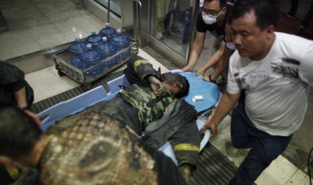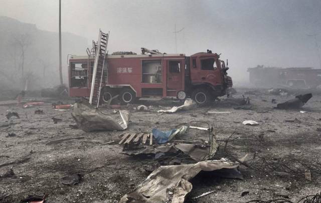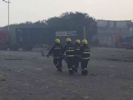 在被炸毀的消防車(chē)附近,消防人員正在搬運(yùn)隊(duì)友尸體,至少三具被燒焦的尸體被抬走。隨后被送往附近泰達(dá)醫(yī)院,直接送進(jìn)了太平間。爆炸中心附近,每一名消防隊(duì)員均手持一個(gè)滅火器,哪里有明火便去哪兒滅。
